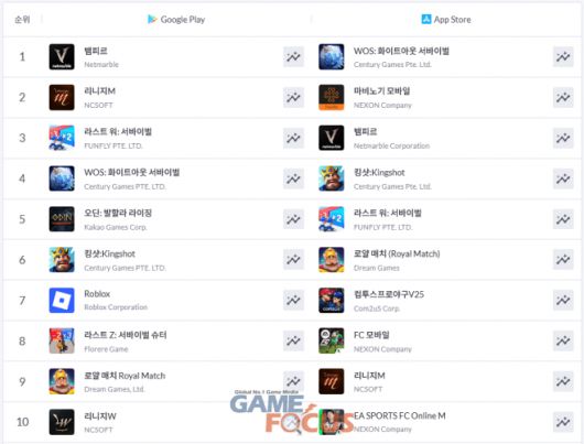 구글 플레이에서는 TOP 5 내 MMORPG 3종과 '라스트 워: 서바이벌', '화이트아웃 서바이벌' 등이 이름을 올렸다. '뱀피르'의 독주가 이어지는 가운데 '리니지M'(2위), '오딘: 발할라 라이징'(5위) 등이 그 뒤를 추격하고 있다. TOP 10으로 범위를 넓혀 보면 '킹샷', '로블록스', '라스트 Z: 서바이벌 슈터', '로얄 매치', '리니지W' 등이 자리하고 있다.