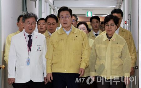 [서울=뉴시스] 고범준 기자 = 이재명 대통령이 29일 서울 중구 국립중앙의료원에서 열린 응급의료현장 간담회에 입장하고 있다. 왼쪽부터 서길준 국립중앙의료원장, 이 대통령, 정은경 보건복지부 장관. 2025.09.29. bjko@newsis.com /사진=고범준 |