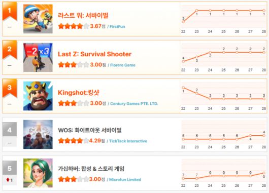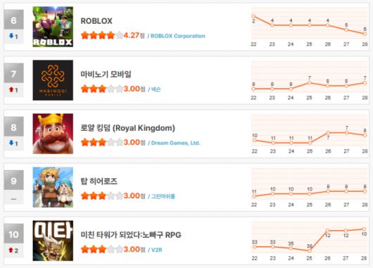그 뒤를 이어 ‘WOS: 화이트아웃 서바이벌’은 4위로 한 계단 상승했고, ‘가십하버: 합성 & 스토리 게임’이 다시 TOP 5에 복귀하면서 주목을 끌었다. 반면, 한때 최상위권을 지키던 ‘로블록스’는 연속 하락세를 이어가며 6위까지 내려앉았다. 체면을 차린 건 ‘마비노기 모바일’로, 7위까지 상승하며 다시 저력을 보여줬다. ‘로얄 킹덤’은 8위에 안착하며 순위를 유지했다.