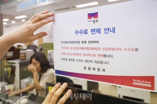 국가정보자원관리원(국정자원) 대전 본원 화재로 전산망 마비 사태가 나흘째 이어지는 가운데 29일 서울 종로구 종로구청에서 직원이 민원대에 주민등록 등·초본과 인감증명서의 수수료 면제 안내문을 붙이고 있다. 조현호 기자 hyunho@ |