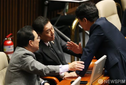 [서울=뉴스핌] 정일구 기자 = 김병기 더불어민주당 원내대표와 문진석 원내운영수석부대표, 박홍근 의원이 29일 오후 서울 여의도 국회에서 열린 제429회 국회(정기회) 제9차 본회의에서 대화를 나누고 있다. 2025.09.29 mironj19@newspim.com