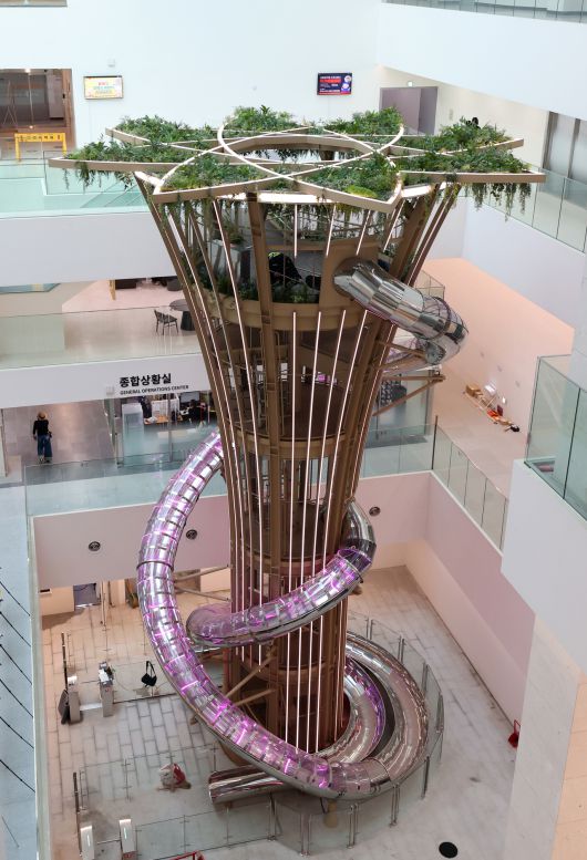 먼저 ‘놀거리’는 신청사 중정에 설치된 높이 15m의 초대형 미끄럼틀(슬라이드)이다. 운영을 시작한 지 20일 만에 6000여 명이 다녀갈 정도로 이미 시민들에게 큰 인기를 얻고 있다.
