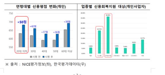 금융위에 따르면 지난달 말까지 연체 채무를 다 갚은 개인의 신용평점은 평균 40점 상승(616→656점)했다. 특히 20대(+50점), 30대(+42점) 등 청년층의 재기 지원효과가 크게 나타났다는 설명이다. 이번 조치로 약 29만명이 신용카드를 새로 발급받고 약 23만명이 은행권 신규대출 평균평점을 뛰어넘을 것으로 예상된다.