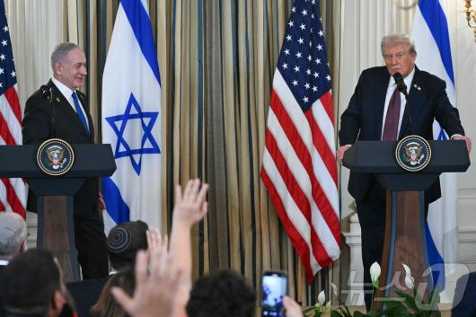 도널드 트럼프 미국 대통령과 베냐민 네타냐후 이스라엘 총리가 29일(현지시간) 미국 워싱턴DC에서 가자지구에서의 이스라엘군 단계적 철수와 평화위원회 및 국제안정화군 설치 등을 제안하는 가자전쟁 종식안을 발표하고 있다. 2025.09.29. ⓒ AFP=뉴스1 ⓒ News1 류정민 특파원 |