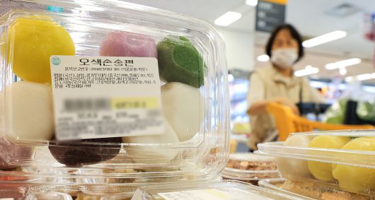 한국농수산식품유통공사 가격정보에 따르면 찹쌀가격은 지난 26일 기준 평균 소매가격이 1㎏당 6천412원으로 작년보다 61.1% 상승한 가운데 추석 연휴을 앞둔 29일 서울 시내 한 마트에 송편이 진열돼 있다. /뉴스1 |