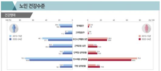 최근 10여년 간(2013~2015년과 2022~2024년) 65세 이상 노인의 건강행태를 살펴본 결과 남자의 경우 현재흡연율(궐련)은 1.8%포인트 감소했으나 여전히 10명 중 2명은 흡연자였다. 또 고위험음주율은 4.5%포인트 증가한 반면, 유산소 신체활동 실천율은 9.0%포인트나 감소했다. 남녀 모두 근력운동 실천율은 증가했다.