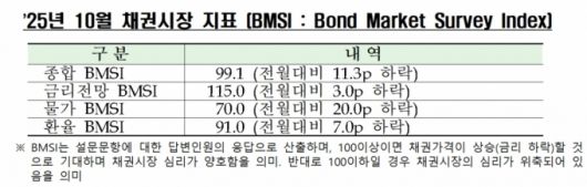 금융투자협회(금투협)가 30일 발표한 '2025년 10월 채권시장지표(BMSI)'에 따르면 채권 종합 BMSI(bond market survey index)는 전월 대비 11.3포인트 하락한 99.1이었다.