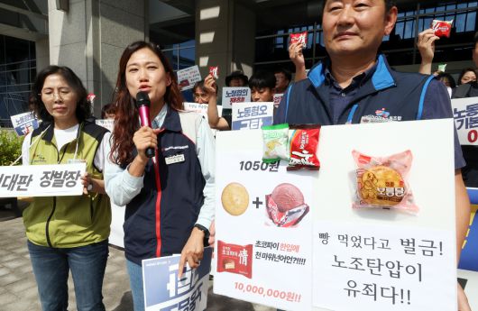 민주노총 전북본부가 30일 전북도청 앞에서 기자회견을 열고 초코파이 절도 사건에 대한 무죄 선고를 촉구하고 있다. 전주=연합뉴스 |