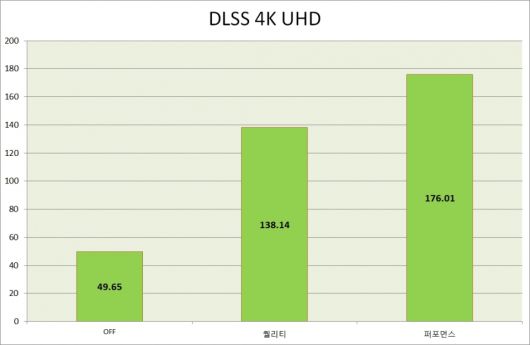 3D마크 DLSS 테스트를 UHD 해상도에서 진행한 결과다. DLSS off 상태에서는 약 49.65FPS, DLSS on 프레임생성 2 퀄리티 모드에서는 138.14FPS, DLSS on 프레임생성 2 퍼포먼스 모드에서는 176.01FPS,