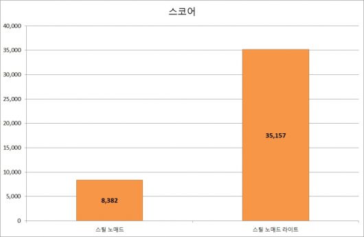3D마크 스틸 노마드 벤치마크 결과이다. 스틸 노매드의 스코어는 8,382점, 스틸 노매드 라이트의 스코어는 35,157점으로 측정되었다.