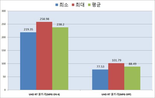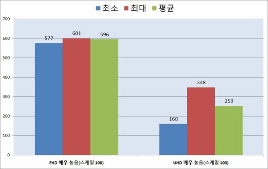 '오버워치 2'는 매우 높음 옵션에 렌더링 스케일 100% 설정으로 훈련장에서 측정을 진행했다. FHD 환경에서는 최소 577FPS 최대 601FPS 평균 596FPS로 측정됐다. 해상도를 UHD로도 설정했는데 최소 160FPS 최대 348FPS 평균 253FPS로 측정되었다.