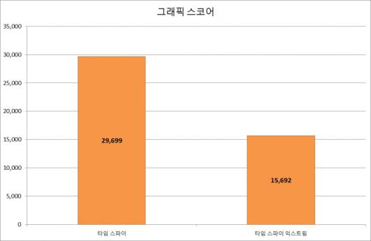 3D마크 타임 스파이 벤치마크 결과이다. 타임 스파이의 그래픽 스코어는 29,699점, 타임 스파이 익스트림의 그래픽 스코어는 15,692점으로 측정되었다.