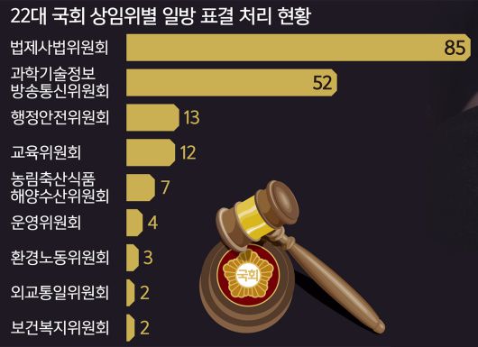 일방 표결이 가장 많은 상임위는 법제사법위원회와 과학기술방송정보통신위원회다. 민주당 정청래·이춘석(현 무소속) 의원을 거쳐 추미애 의원이 위원장으로 있는 법사위가 85건(전체회의 74건, 소위원회 11건)으로 가장 많은 일방 표결 횟수를 기록했다. 민주당 최민희 의원이 위원장으로 있는 과방위는 52건(전체회의 47건, 소위원회 5건)으로 뒤를 이었다. 민주당 신정훈 의원이 위원장인 행정안전위원회도 13건(전체회의 12건, 소위원회 1건)으로 3위에 올라 이들 세 상임위의 일방 표결 사례가 전체의 83%에 달했다.