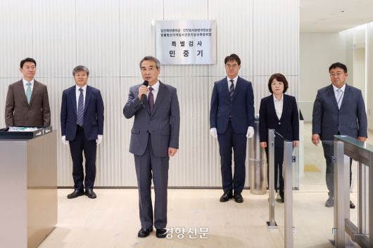 윤석열 전 대통령 부인 김건희 여사와 관련한 각종 의혹 사건을 수사하는 민중기 특별검사가(사진 왼쪽에서 세번째) 지난 7월2일 서울 종로구 KT광화문빌딩에 마련된 사무실 앞에서 현판 제막을 한 뒤 발언하고 있다. 정지윤 선임기자 |