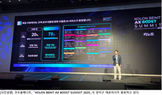 코오롱그룹의 정보기술(IT) 업체 코오롱베니트가 30일 서울 용산의 드래곤시티호텔에서 'AX 부스트 서미트' 행사를 갖고 인공지능 전환(AX)을 위한 새로운 목표인 'AX 조력자(enabler)'와 AX 생태계 확장 전략을 발표했다. 강이구 코오롱베니트 대표는 "인공지능(AI)이 최근 몇 달 동안 수년에 해당하는 변화를 만들었다"며 기업들의 AI 전환을 위한 조력자로 거듭나겠다는 뜻을 밝혔다.