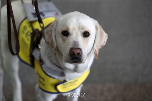 시각장애인 안내견 ‘달다’가 박재만 삼성화재 안내견학교 훈련사와 함께 지난해 4월23일 경기 용인시 기흥구 동백역에서 지하철 탑승 훈련을 하고 있다. 정지윤 선임기자 |