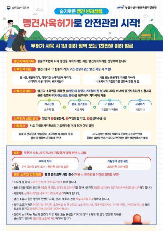 농림축산식품부는 맹견소유자, 동물보호단체, 전문가 등의 의견수렴 결과를 바탕으로 '맹견사육허가제 제도개선 방안'을 1일 확정했다.