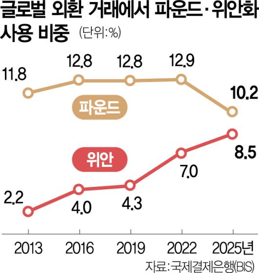 1일 홍콩 사우스차이나모닝포스트(SCMP)와 블룸버그통신 등에 따르면 국제결제은행(BIS) 집계 결과 위안화의 글로벌 거래 규모는 하루 8170억 달러로 세계 외환 거래에서 차지하는 비중이 8.5%를 기록했다. 세계 5위 통화의 지위를 유지한 가운데 거래 규모가 지속적으로 늘고 있다는 사실이 눈길을 끈다. 2013년 2.2% 수준에 그쳤던 위안화의 비중은 2016년 4.0%, 2019년 4.3%, 2022년 7%로 매년 증가하고 있다. 위안화 거래 비중이 늘면서 거래량 4위인 영국 파운드화 자리도 위협하고 있다. 2022년 12.9% 비중을 점유하던 파운드화는 올해 10.2%로 떨어졌다. 2013년만 해도 11.8%를 기록해 위안화와 8.4%포인트 격차를 보였으나 올해는 1.7%포인트까지 줄었다.