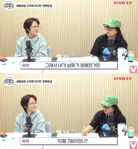 여기에 지난 5월 김숙은 송은이, 이기찬과 대화 중 "내가 날짜가 정해졌다. 10월 7일이었나"라고 언급해 의혹에 불을 지폈다.