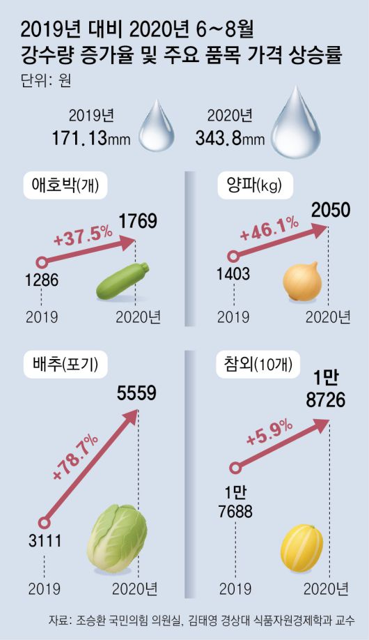 실제로 2020년 강수량이 2019년 대비 100.9% 늘자 애호박의 여름철 평균 소매가격은 개당 1769원으로 전년도 1286원 대비 37.5% 올랐다. 2019년 포기당 3111원이었던 배추는 78.7% 급등해 5559원으로 가격이 뛰었고, kg당 1403원이었던 양파 역시 2020년 6∼8월 폭우로 가격이 46.1% 급등하며 2050원까지 상승했다.