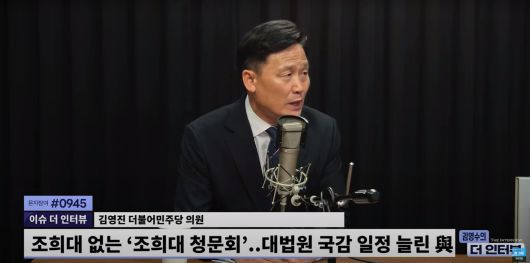 □ 김영진 : 결론적으로는 조희대 없는 조희대 청문회가 됐잖아요. 그래서 조희대 청문회 관련해서는 지난 5월에 청문회가 있었어요. 지난 5월에 청문회가 있었기 때문에 이번에도 제가 판단하기에는 동일할 거다. 조희대 대법원장이나 대법관들이 나오지 않을 거고 그런 상황에서 동일한 나오지 않는 청문회를 두 번 하는 것 자체가 새로운 사실이 없는 가운데 하는 것은 적절하지 않고. 새로운 사실이 있고 준비된 상황에서 얘기하는 게 필요하다라는 부분이 있었고요. 그리고 두 번째는 실제 도지사 청문회를 추진했던 첫 출발이 4인 회동이 있었지 않습니까? 조희대, 한덕수, 김충식, 정상명의 4인회동이 있었다라고 하는 언론의 제보를 가지고 사실 관계를 확인해 보고 대선 개입의 여부를 그에 따라서 진행해 보겠다. 이런 취지였는데 4인 회동에 대한 내용들이 불투명했기 때문에 그걸 가지고 진행하는 것 자체가 너무 급발진한 거 아니냐. 그리고 두 번째, 세 번째는 여야가 아닌가. 여당이기 때문에 원내 지도부나 당 지도부와 함께 논의해 나가면서 내용을 축적해 나가고 그 속에서 청문회를 개최하더라도 하는 게 필요하다. 그런 취지로 말씀을 드렸어요. 실제로는 결론은 조희대 없는 조희대 청문회가 됐는데 그 썩 좋은 모습은 아니었다. 저는 그렇게 생각을 하고. 그런데 결론적으로 저는 조희대 대법원장과 조희대 사법부도 절차와 과정 속에서 왜 그렇게 급하게 대선 과정 속에서 대선 개입으로 비치는 정치적인 판단이라고 누구나 인정할 수 있는 형태로 결정을 했는지에 대해서 저는 국민들에게 소명을 해야 된다. 그 소명의 책임이 저는 면제된 건 아니다라고 봐요. 저는 빠르게 조희대 대법 대법원장이 의견을 표명할 필요가 있다고 보고 있습니다.