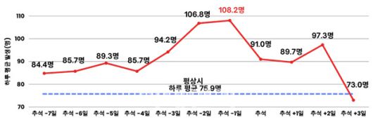 [이데일리 이지현 기자] 추석 연휴 동안 하루 평균 96.3명씩 교통사고로 병원을 찾는 것으로 나타났다.