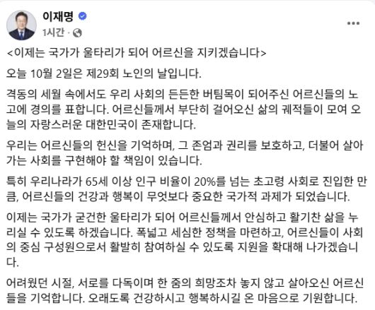 이재명 대통령은 2일 제29회 노인의 날을 맞아 “격동의 세월 속에 우리 사회의 든든한 버팀목이 돼 준 어르신들의 노고에 경의를 표한다”며 “이제는 국가가 울타리가 돼 어르신을 지키겠다”고 밝혔다.