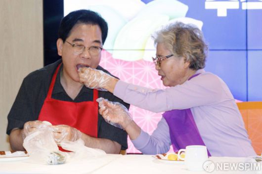 [서울=뉴스핌] 윤창빈 기자 = 송언석 국민의힘 원내대표가 2일 오전 서울 동대문구 동백꽃노인종합복지관에서 추석맞이 송편빚기 봉사활동을 하며 송편을 먹고 있다. 2025.10.02 pangbin@newspim.com |