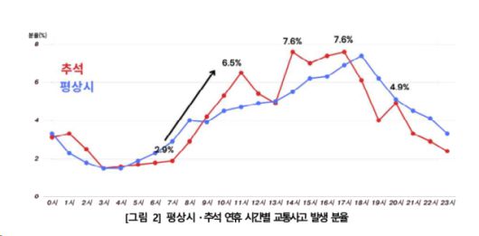 추석 연휴 교통사고가 가장 많이 발생하는 시간은 오후 2시와 오후 5시로 이 시간대 교통사고 발생률이 각각 7.6%로 하루 중 가장 높았다. 24시간 단위로 교통사고 발생률의 추이를 보면 오전 7시(2.9%)부터 오전 11시(6.5%)까지 급격하게 증가했다가 오후 6시가 지나면 평소보다 낮은 수준으로 감소했다.