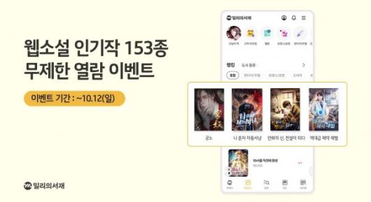 [파이낸셜뉴스] kt 밀리의서재는 추석 연휴를 맞아 긴 연휴 기간에 몰입해 읽을 수 있는 웹소설과 웹툰을 추천하고, 다양한 이벤트를 준비했다고 2일 밝혔다.