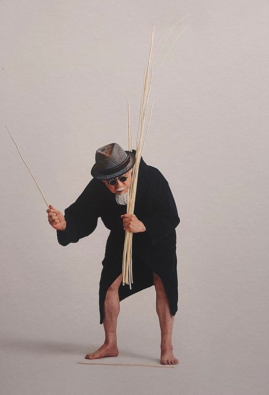 이 색다른 행위예술을 담은 영상이 지금 서울 북촌 화동 갤러리 백아트에서 상영되고 있다. 한국 미술판에서 행위예술의 최고 대가로 꼽히는 성능경(81) 작가의 개인전 마당이다. 퍼포먼스 영상과 함께 전시장 곳곳에 서울 인왕산 숲 싸리나무를 베고 깎아 만든 회초리 다발들을 세워놓은 모습도 볼 수 있다. 중절모 쓰고 검은 가운을 걸친 채 회초리를 휘두르는 퍼포먼스 실연 장면 연작 사진들도 내걸렸다.
