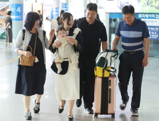 추석 연휴를 하루 앞둔 2일 오후 부산 동구 부산역에서 마중 나온 어르신들이 아들 부부와 손주를 반기며 환하게 웃고 있다. 연합뉴스 |