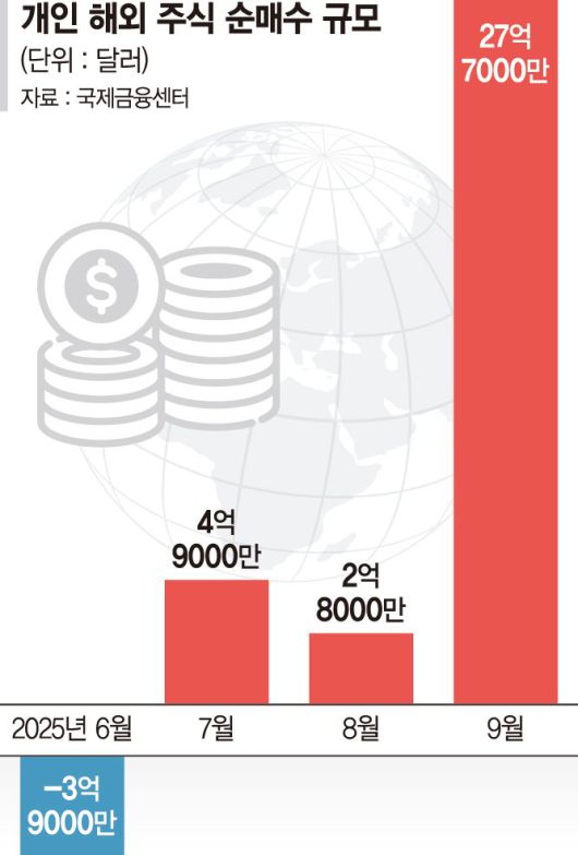 2일 금융투자업계 및 국제금융센터에 따르면 지난달 총 27억7000만달러(3조8879억원) 규모의 해외 주식을 순매수했다. 지난 8월(2억8000만달러)의 10배에 달하는 규모다.