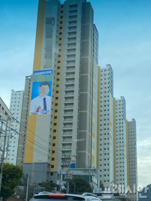 ▲광주 남구 주월동 한 오피스텔 동에 걸린 한 광주시의원의 현수막.2025.10.02ⓒ독자 |