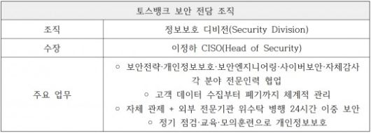 토스뱅크는 개인정보보호와 정보보안을 전담하는 독립 조직인 ‘정보보호 디비전(Security Division)’을 운영하고 있다.