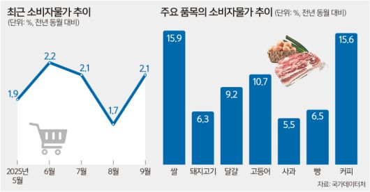 9월 소비자물가 상승률이 두 달 만에 2%대로 다시 뛰었다. 추석을 앞두고 쌀값과 달걀값이 큰 폭으로 오르며 먹거리 물가를 끌어올렸고, 통신사 요금 인하 효과가 사라지고 석유류 가격이 다시 오르며 전체 물가를 자극했다.
