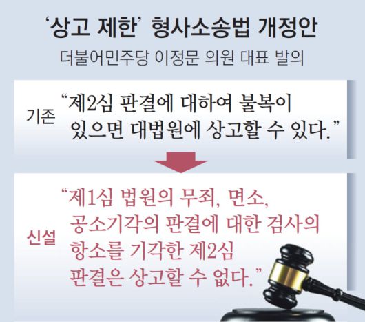 민주당 이정문 의원이 1일 발의한 형사소송법 개정안은 ‘상고의 제한’ 규정을 신설하는 내용을 담고 있다. 현행 형사소송법은 “2심 판결에 대해 불복이 있으면 대법원에 상고할 수 있다”고 적시하고 있지만 “제1심 법원의 무죄, 면소, 공소기각의 판결에 대한 검사의 항소를 기각한 제2심 판결은 상고할 수 없다”는 내용을 신설하겠다는 것.