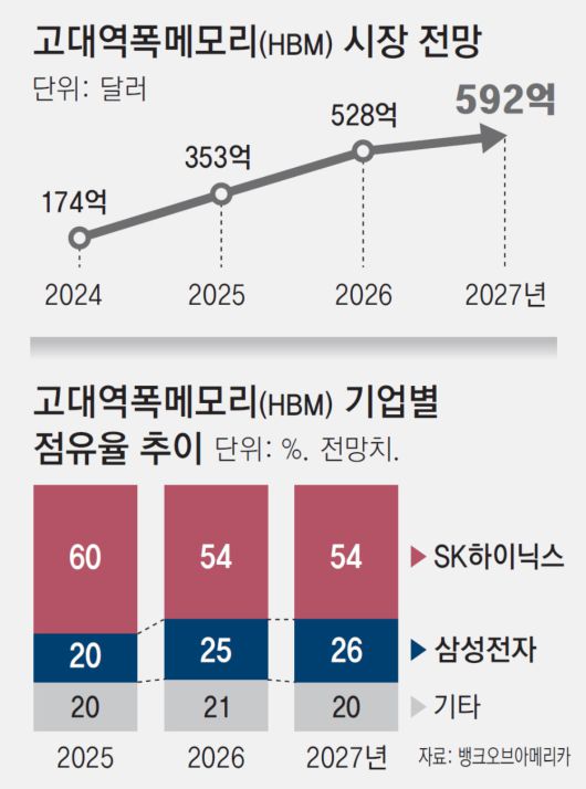 현재 HBM 시장 1위는 SK하이닉스(시장 점유율 60%)로 삼성전자(20%), 미국 마이크론(20%)과 3파전을 벌이고 있다. 미국 뱅크오브아메리카는 2027년에도 SK하이닉스(54%)와 삼성전자(26%)가 HBM 시장을 장악하며 한국 기업들의 합산 점유율이 80%에 이를 것으로 보고 있다. 삼성전자는 HBM 4세대(HBM3)에서 실기했지만 최근 5세대(HBM3E)에서 엔비디아의 테스트를 사실상 통과했다.