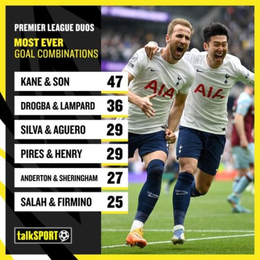 이른바 '손케 듀오'는 2015-2016시즌부터 8년간 토트넘에서 함께 뛰며 프리미어리그에서만 무려 47골을 합작했다. 이는 여전히 프리미어리그 역대 최다 합작골 기록으로 남아있다. 득점도 손흥민이 24골 23도움, 케인이 23골 24도움으로 딱 절반씩 책임졌다. 둘은 2020-2021시즌엔 14골을 함께 만들어내며 단일 시즌 최다골 합작 기록도 갖고 있다.