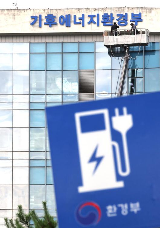 30일 정부세종청사 외벽에서 기후에너지환경부 현판 설치 작업이 한창이다. 2025.9.30 [사진=연합뉴스] |