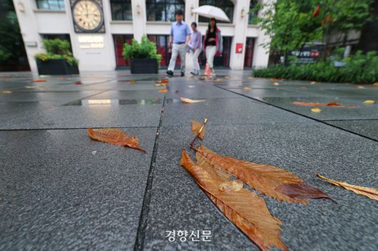 서울 광화문 광장을 지나는 시민들이 우산을 쓰고 걷고 있다. 정효진 기자
