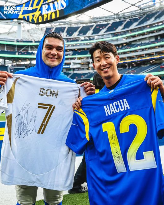 손흥민은 미국 생활을 즐기고 있다. 지난달엔 미국 프로야구 LA 다저스를 방문해 시구를 하며 화제를 모았다. 이번엔 NFL 경기장에 방문했다. 손흥민은 램스의 푸카 나쿠아와 유니폼을 교환하며 즐거운 시간을 보냈다.
