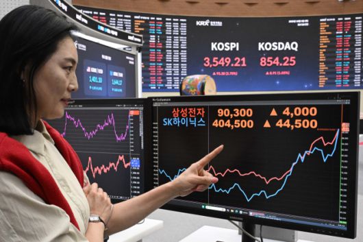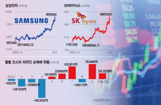 오픈AI·구글 등 글로벌 빅테크 기업들의 인공지능(AI) 인프라 투자가 가파르게 확대되면서 서버용 D램, 낸드 수요가 유례없는 동반 호황을 맞았다는 진단이다. 샘 올트먼 오픈AI 대표는 이달 1일 삼성전자·SK하이닉스와 ‘스타게이트’ 프로젝트 반도체 칩 공급 의향서(LOI)를 체결하기로 했다. 스타게이트는 오픈AI와 오러클, 소프트뱅크가 향후 4년간 5000억 달러를 투자하는 AI 핵심 인프라 구축 프로젝트다. 이종형 키움증권 리서치센터장은 “시가총액의 4분의 1을 차지하는 삼성전자와 SK하이닉스가 지수를 통째로 끌어올렸다”며 “10월 코스피는 상단 3650선까지도 가능하다”고 분석했다.