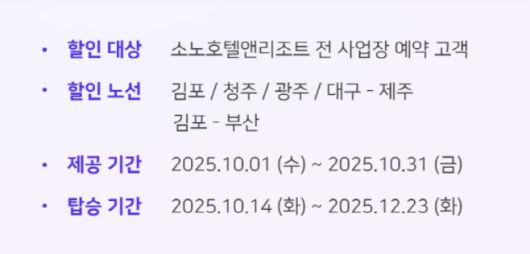 소노인터내셔널은 10월 한달 간 소노호텔앤리조트 홈페이지를 통해 객실을 예약하면 티웨이항공 국내선 할인 혜택을 제공한다고 밝혔다. 객실 예약시 제공되는 시크릿 쿠폰으로 티웨이항공의 김포·청주·광주·대구-제주 노선, 김포-부산 노선 항공권 할인 혜택을 받을 수 있다. 해당 쿠폰은 오는 14일부터 12월 23일까지 사용 가능하다.