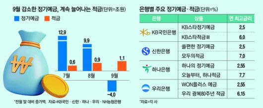 3일 5대 시중은행에 따르면 지난달 정기예금 잔액은 950조7015억원으로 전월 말 대비 4조304억원이 감소했다. 지난 7월과 8월 각각 12조9257억원, 9조8719억원이 늘어난 것과 대조적이다.