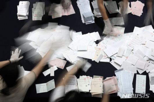 [서울=뉴시스] 백동현 기자 = 제8회 동시지방선거일인 1일 오후 서울 노원구 서울과학기술대학교에 마련된 개표소에서 선거 사무원들이 개표하고 있다. 2022.06.01. livertrent@newsis.com |