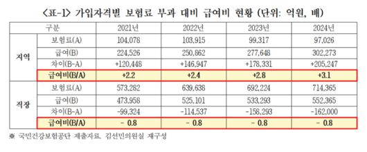 연도별 급여비 차이가 커지는 점도 문제다. 지역가입자의 경우 부과된 보험료와 받은 급여액의 차이가 2021년 +12조원(급여비 2.2배)에서 2024년 70.4% 증가한 +20.5조원(급여비 3.1배)으로 보험료 대비 급여비가 점점 높아지는 반면, 직장가입자의 경우 2021년 -9.9조원(급여비 -0.8배)에서 2024년 -16.2조원(급여비-0.8배)으로 보험료 대비 급여비가 동일하다.