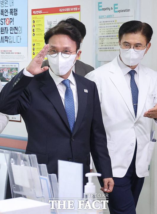 [더팩트ㅣ성남=임영무 기자] 김민석 국무총리가 4일 오후 입원 장병을 위문차 경기 성남시 국군수도병원을 찾아 의료진의 거수경례에 답하고 있다.