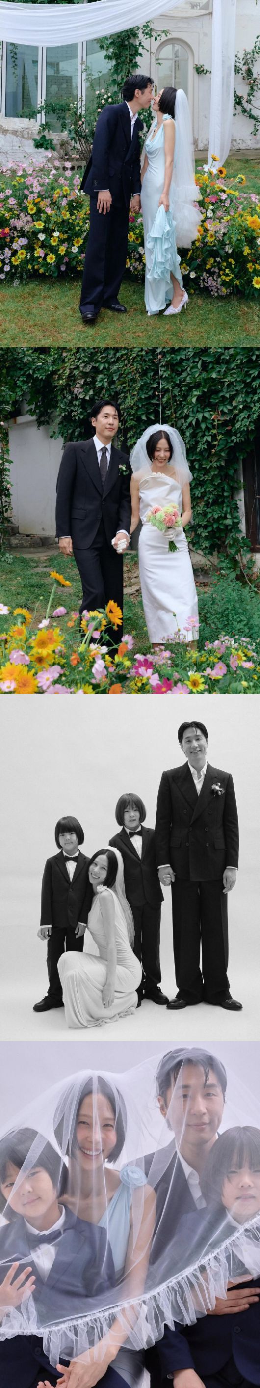 또 다른 사진에서는 김나영은 여리여리한 몸매가 드러나는 하늘색 드레스를 입고 우아한 자태를 드러냈다. 특히 이날 결혼식에는 김나영의 두 아들 신우, 이준도 함께 턱시도를 입고 참석해 눈길을 끌었다. 밝고 선한 미소가 똑 닮은 네 식구의 모습이 보는 이들마저 흐뭇하게 만들었다.