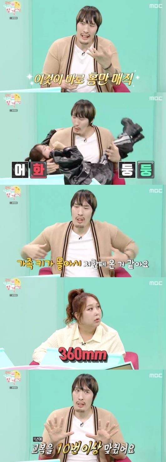 최홍만은 거대한 발 크기로 인해 신발 또한 외국에서 특별히 주문한다고 밝혔다. 최홍만은 신발을 벗어서 공개했고, 홍현희의 상반신만한 크기에 모두가 놀라워했다.